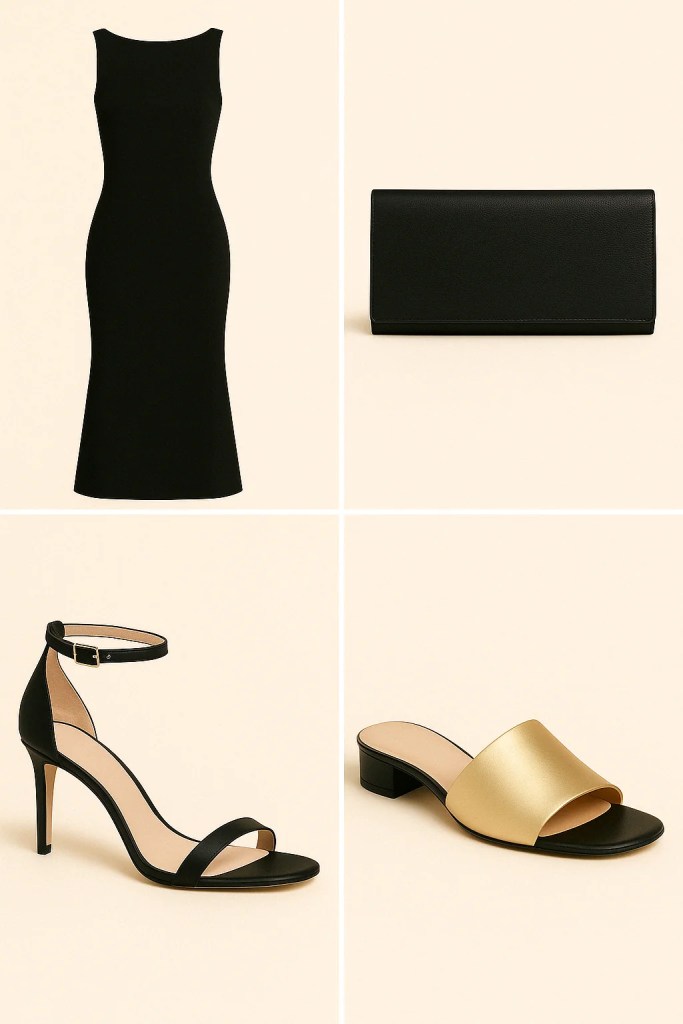 This outfit is the epitome of classic sophistication, centered around the little black dress (LBD). Its sleek silhouette and timeless design make it a versatile choice for a variety of formal occasions.